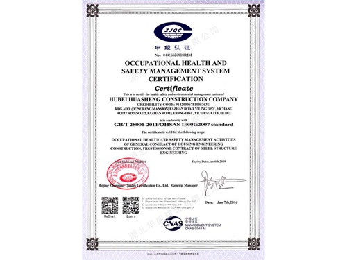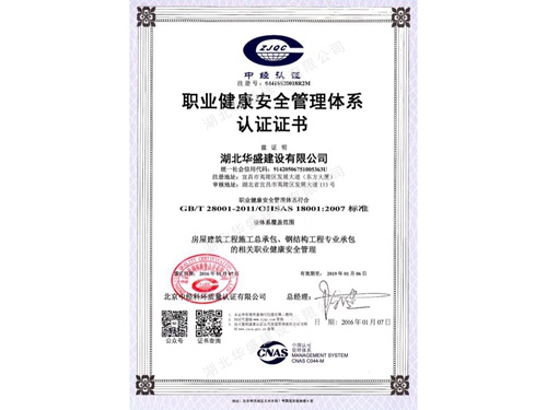 职业健康安全管理体系认证证书
